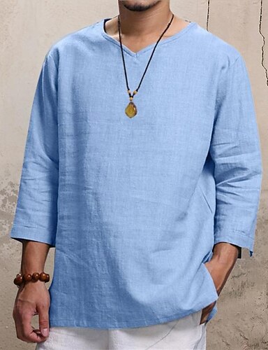 Муж. Рубашка Летняя рубашка Повседневная рубашка Пляжная рубашка Черный Темно синий Хаки Бежевый Светло-синий Длинный рукав Полотняное плетение V-образный вырез Праздники Отпуск Одежда