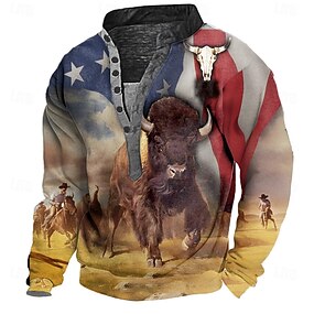 Муж. Корова Американский флаг США Толстовка Этнический 3D Вырез под горло Подарок Путешествия Уличная одежда Коричневый Кнопка спереди Осень Зима Дизайнер