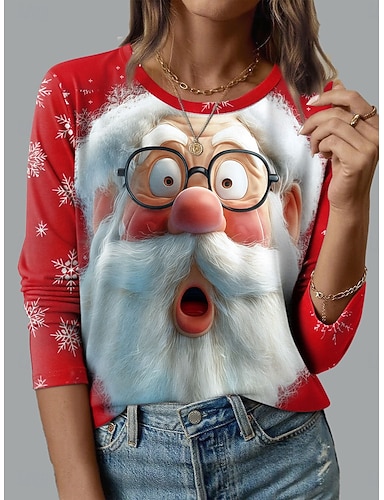 Новогодняя тематика Жен. Футболка Графика Дед Мороз Мода На каждый день Длинный рукав Вырез под горло Круглый вырез Обычные топы Повседневные выходные С принтом Красный Синий Зеленый