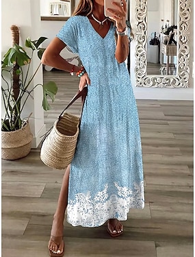 Макси-платье для женщин A-силуэт летнее элегантное повседневное отпуск ежедневная регулярная посадка омбре цветочная графика короткий рукав вырез в форме буквы V синий летний весенний осенний