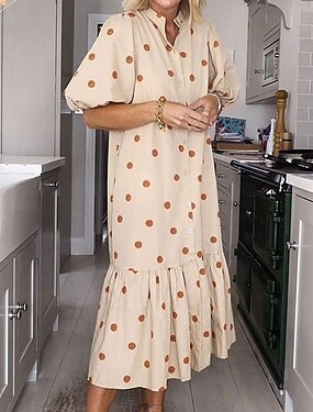 Жен. Платье средней длины Повседневное платье Мода на открытом воздухе Повседневные Праздники Стандартный Горошек С короткими рукавами V-образный вырез Белый Хаки Лето