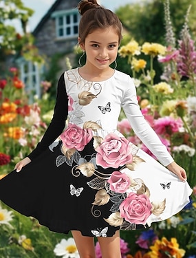 Пасха Девушки ' 3D Графика Цветы Платье Длинный рукав Лето Весна Отпуск Повседневные Праздники Принцесса Красивый Милая Дети 4-12 лет Повседневное платье Платье A-силуэта До колена Стандартный