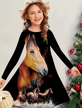 Девушки ' 3D Лошадь Платье Длинный рукав Лето Весна Отпуск Повседневные Праздники Принцесса Красивый Милая Дети 4-12 лет Повседневное платье Платье A-силуэта До колена Стандартный