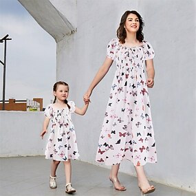 Летние платья «Мама и я», летние платья с принтом бабочки для женщин и девочек, одинаковые платья для мамы и дочки, длинные платья макси с короткими рукавами и пышными рукавами, семейный образ