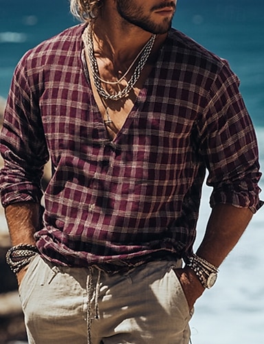 Муж. Рубашка Льняная рубашка Поповер Рубашка Повседневная рубашка В клетку Отпуск Гавайский Винный Длинный рукав V-образный вырез Весна Осень Одежда
