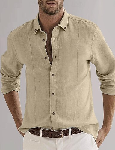 Муж. Рубашка из хлопка и льна Полотняное плетение Отпуск На каждый день Черный Белый Небесно-голубой Цвет хаки Длинный рукав Лацкан Одежда Кнопка вниз