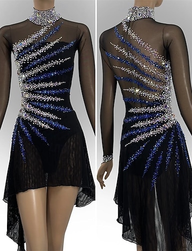 Платье для фигурного катания Жен. Девочки Катание на коньках Платья Черный Пэчворк Асимметричный шов Сетка Спандекс Эластичность Учебный Соревнование Одежда для фигурного катания Классика Стразы