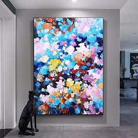 Картина маслом ручной работы, настенное искусство, украшение, современный абстрактный синий фон, густой масляный нож, цветы для декора дома, столовой, натянутая рама, подвесная картина/рулонный холст