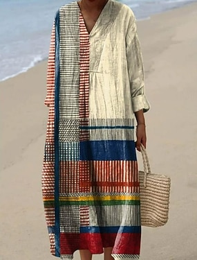 Трикотажное платье миди для женщин V-образный вырез длинный рукав кафтан легкий свободный А-силуэт повседневное бохо для выхода графический геометрический полосатый длинный рукав V-образный вырез