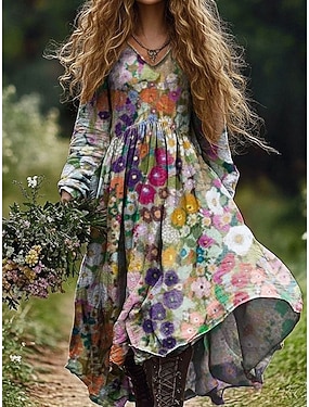 Жен. Длинное платье Платье A-силуэта Отпуск На каждый день Богемный На выход Пляж Свободное облегание Цветочный принт Графика Геометрический принт Длинный рукав V-образный вырез
