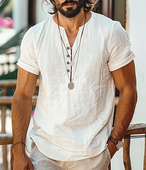 Муж. Рубашка льняная рубашка Летняя рубашка Пляжная рубашка Сплошной цвет Отпуск Кьюриз Черный Белый С короткими рукавами Круглый вырез Лето Весна Одежда