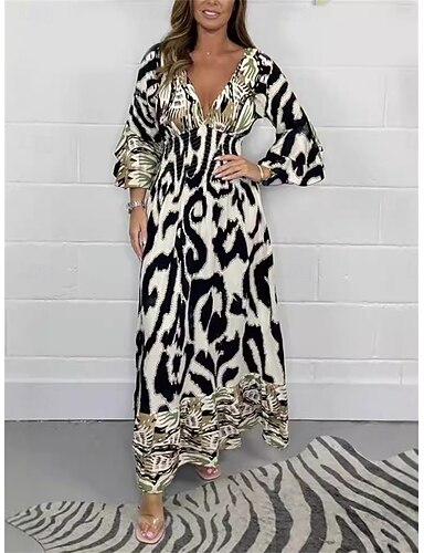 Жен. Длинное платье Сарафан Платье A-силуэта Отпуск На каждый день Богемный Для вечеринок Праздники Пляж Стандартный Цветочный принт Графика Геометрический принт Длинный рукав V-образный вырез