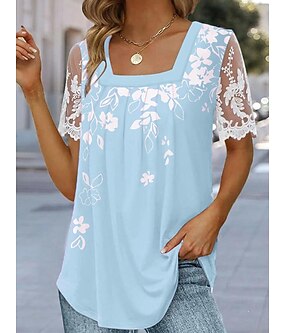 Жен. Футболка Сетчатый топ в стиле пэчворк Кружевная футболка Цветочный принт Классический С короткими рукавами Квадратный вырез Обычные топы Праздники выходные Кружева С принтом