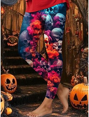 Жен. Леггинсы Отпуск Винтаж Мода По щиколотку ЗавышеннаяPantsHalloween Графика Черепа Хэллоуин Рисунок Мягкий Дышащий Эластичная Отпуск Для улицы Повседневные Белый Синий Зеленый Цвет хаки