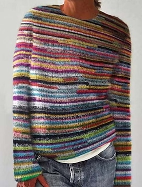 Жен. Вязаная ткань Мода Уличный стиль Полоски С принтом Вырез под горло Трикотаж Длинный рукав Обычные топы Вязать На выход Цвет радуги Осень Зима
