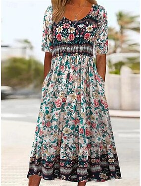 Жен. Длинное платье Повседневное платье Платье в стиле 50-х годов Платье A-силуэта Платье в стиле бохо На каждый день Повседневные Осеннее платье Стандартный Цветочный принт С короткими рукавами