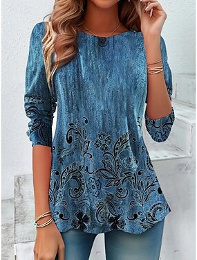 Женская футболка с круглым вырезом длинным рукавом туника омбре растения повседневная круглый вырез обычные топы на каждый день печать розовая синяя небесно-голубая пыльно-синяя светло-голубая весна