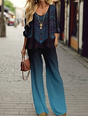 Женский комплект из 2 предметов спортивная повседневная футболка и брюки длинный рукав V-образный вырез геометрический градиентный принт на улице casual синий фиолетовый зеленый весна и осень обычная