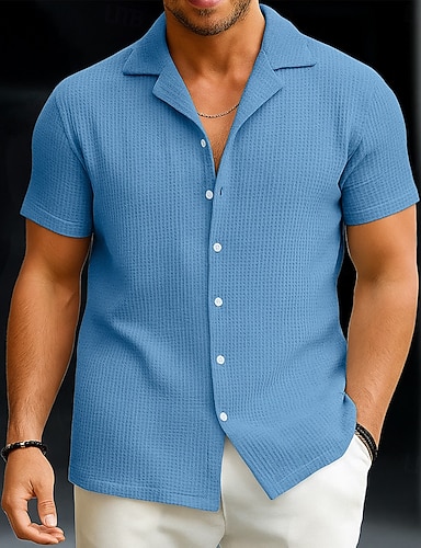Муж. Летняя рубашка Рубашка на пуговицах Повседневная рубашка Рубашка с воротничком Вафельная вязаная рубашка Белый Желтый Красный Синий С короткими рукавами Полотняное плетение Текстура