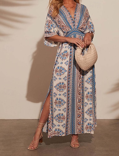 Жен. Длинное платье Повседневное платье Шикарные платья в стиле бохо Богемия Симпатичные Стиль Стиль Отпуск Повседневные Пляж Свободное облегание Графика С короткими рукавами V-образный вырез