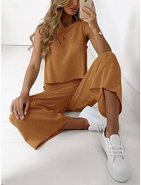 женская пижама домашняя одежда комплекты из двух предметов повседневные однотонные комплекты из хлопка и льна брюки для дома без рукавов круглый вырез черный белый коричневый хаки светло-серый лето весна