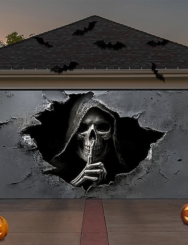 Хэллоуин, гаражные ворота, пугало, замок, баннер, дом с привидениями, сцена ужаса, жуткий фон, гобелен для улицы, стены, забора, двора, украшение для вечеринки на Хэллоуин