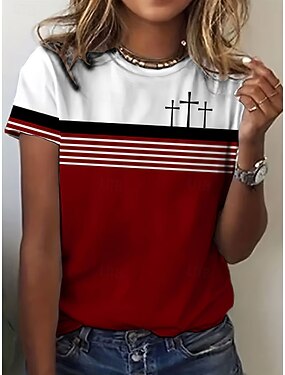 Жен. Футболка Графика Полоски Винтаж Стиль Классика С короткими рукавами Вырез под горло Обычные топы Повседневные выходные С принтом Красный Синий Коричневый Лето Весна