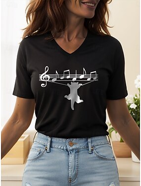 Жен. Блуза Графика Кот Буквы Винтаж Стиль Классика С короткими рукавами V-образный вырез Обычные топы Повседневные На выход Одежда для пляжа С принтом Черный Белый Лето Весна