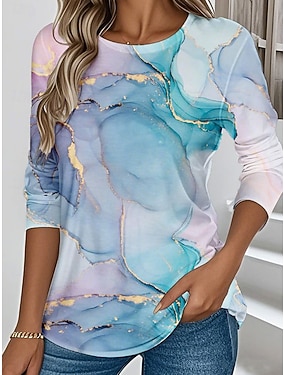 Женская футболка с круглым вырезом длинным рукавом туника графика мрамор винтажный стиль классика обычные топы повседневная уикенд принт синий лето