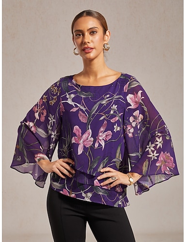 женская блузка из прозрачного шифона темно-фиолетового цвета с цветочным принтом, короткими рукавами, многослойным подолом, круглым вырезом, пуловер