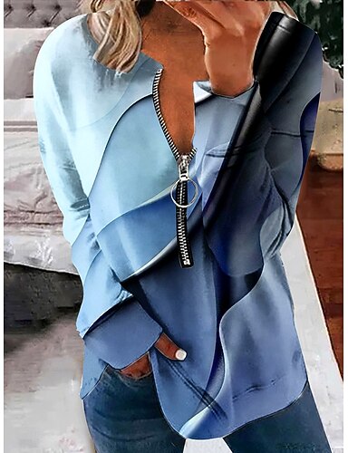 Жен. Пуловер Толстовка Толстовки с застежкой-молнией Графика Абстракция Мода На каждый день Длинный рукав Вырез под горло Обычные топы Для улицы На каждый день Молния С принтом Синий Лиловый Зеленый