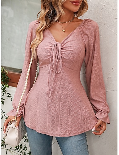Жен. Футболка Полотняное плетение Мода Современное На каждый день Длинный рукав V-образный вырез Обычные топы Повседневные выходные Копченый Розовый Осень Зима