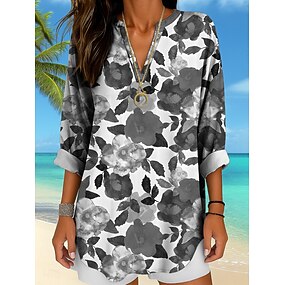 Блуза туника женская с V-образным вырезом длинным рукавом богемного стиля повседневные топы флористический графический принт винтажный тропический обычные топы повседневная одежда желтый красный