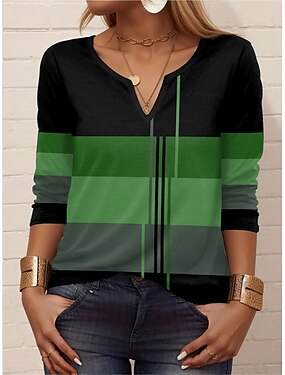 Жен. Футболка Геометрический принт Полоски На каждый день Длинный рукав Зубчатая шея Обычные топы Повседневные С принтом Черный Синий Лиловый Зеленый Лето Весна Осень