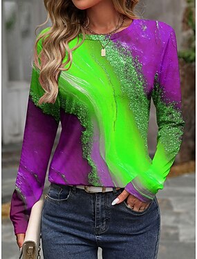 Футболка для женщин Crew Neck Длинный рукав Туника Омбре Графическая Цветной блок Винтажная Стильная Casual Круглый вырез Regular Tops Daily Печать Фиолетовый Оранжевый Зеленый Осень