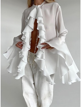 Жен. Рубашка Блуза Сплошной цвет Элегантный стиль Стиль На каждый день Длинный рукав Вырез под горло Обычные топы Офис Повседневные Праздники Оборки Черный Белый Весна Осень Зима