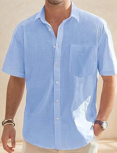 Муж. Рубашка Белая хлопковая рубашка Повседневная рубашка Рубашка из хлопка и льна Полотняное плетение Отпуск Для улицы Черный Белый Темно синий Небесно-голубой С короткими рукавами Лагерный воротник