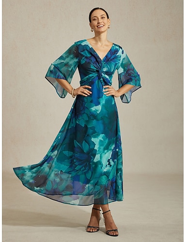 Жен. Платье средней длины Платье A-силуэта Отпуск На каждый день Богемный Стандартный Графика Огурцы Рукав 3/4 V-образный вырез Синий Цвет хаки Весна Осень