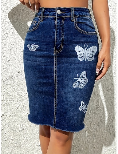 Жен. Юбки Облегающий силуэт Мода На каждый день До колена Завышенная Подол Бабочка Карман С принтом Слабоэластичная Для улицы Повседневные Черный Морской синий Синий Весна Полиэстер Джинса