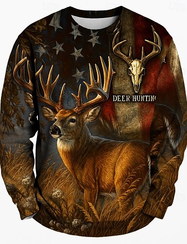 Муж. Олень Толстовка 3D Для охоты Вырез под горло на открытом воздухе Для спорта и активного отдыха Коричневый Crewneck 3D печать Зима Весна & осень Дизайнер