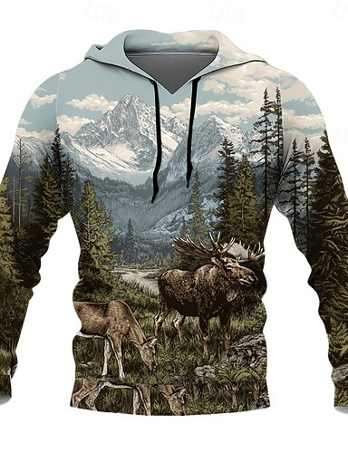 Муж. 3D-печати Олень Толстовка Мода 3D Вырез под горло Дом Для вечеринок Уличная одежда Синий Коричневый Кулиска Осень Зима Дизайнер