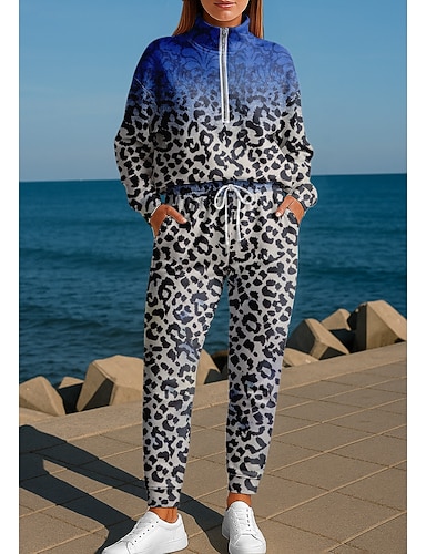 Жен. Толстовка Спортивный костюм Спортивный костюм из двух частей мешковатый Леопард Наборы одежды Осень Тёмно-синий Назначение На открытом воздухе Путешествия Легкость Мода Длинный рукав Спорт
