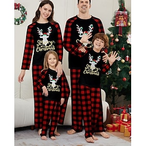 Семейный вид Пижамы В клетку Рождественский образец Дом С принтом Черный Длинный рукав Активный Подходящие наряды