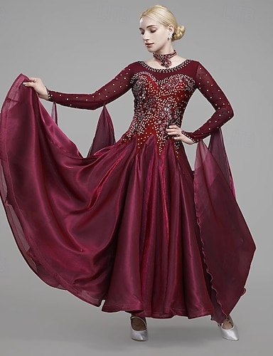 Бальные танцы Платье Стразы Чистый цвет Жен. Выступление Учебный Длинный рукав Завышенная талия Чинлон Органза Тюль