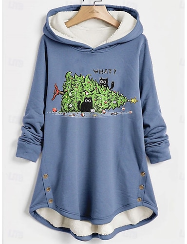 Жен. Толстовка с капюшоном и пуловером Графика Кот Новогодняя ёлка Теплый На каждый день нечеткий Длинный рукав Капюшон Длинные топы Повседневные Спорт С принтом Розовый Синий Серый Осень Зима