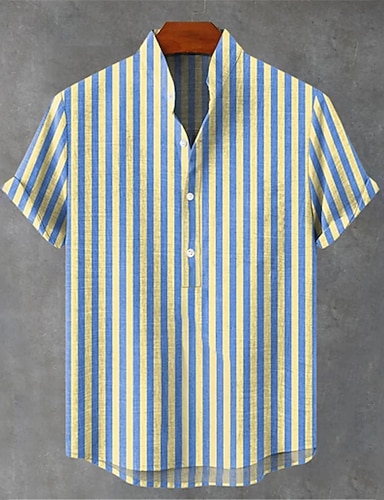 Муж. Льняная рубашка Поповер Рубашка Летняя рубашка Повседневная рубашка Пляжная рубашка Рубашка Хенли Полоса Отпуск Повседневные Синий С короткими рукавами Китайский воротник-стойка Лето Весна Одежда