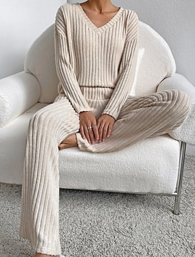 Жен. Мода Уличный стиль Комплекты брюк Длинный рукав V-образный вырез Сплошной цвет Кулиска Отпуск На каждый день Желтый Небесно-голубой Хаки Лето Стандартный