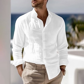 Муж. Рубашка льняная рубашка Рубашка гуаябера Рубашка с воротником-стойкой Летняя рубашка Пляжная рубашка Полотняное плетение Отпуск Кьюриз Белый Темно синий Зеленый Цвет хаки Длинный рукав