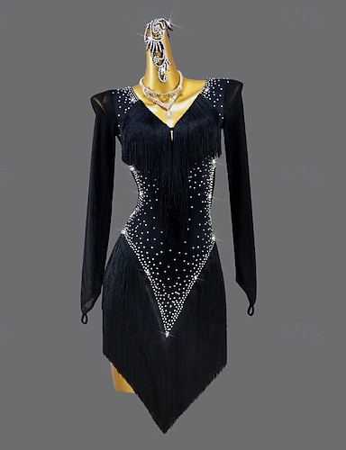 Латино Платье Стразы С кисточками Жен. Девочки Выступление Учебный Длинный рукав Завышенная талия Спандекс Тюль