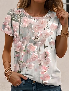 Жен. Футболка Цветочный принт Графика Растения Винтаж Стиль Классика С короткими рукавами Вырез под горло Обычные топы Повседневные выходные С принтом Розовый Лето